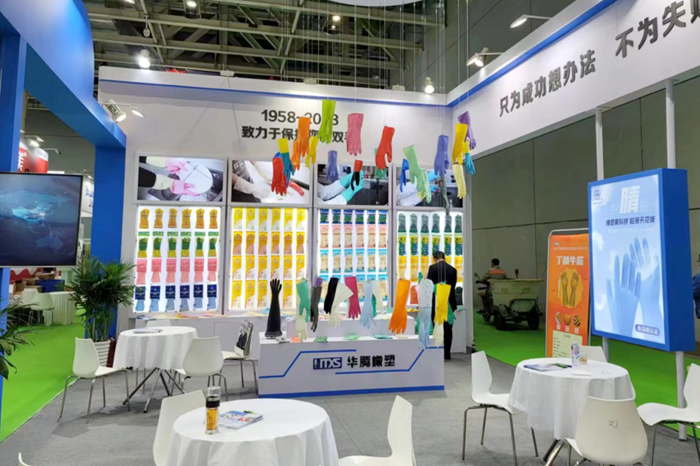 新的LOGO不僅展示著企業(yè)新形象,更昭示著華騰橡塑融入國內大循環(huán)、國內國際雙循環(huán)的雄心。10月15日,華騰橡塑銷售團隊專程來到廣州,參加第134屆中國進出口商品交易會(廣交會),在“工具展區(qū)”和“新材料及化工產品展區(qū)”架設兩大展位,全面推銷橡塑乳膠手套產品和膠板產品。在手套產品展位,展示了公司的家用手套和工業(yè)用手套。多種材質、用途可以充分滿足客戶的不同需求。公司自主研發(fā)的絕緣手套和干箱手套備受觀眾關注;在膠板產品展位,展示了工業(yè)、牧場、運動等系列膠板產品,花型種類豐富,可滿足多種場合的應用需求。