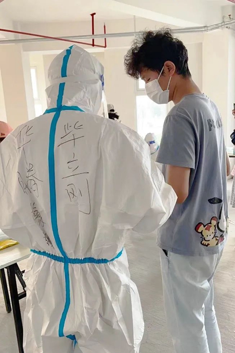 最讓我難以忘記的是穿大白的經(jīng)歷。因這一穿就是三個多小時,以前都是看別人穿防護服,現(xiàn)在輪到我了。防護服密不透風,穿著三個多小時后脫下來時,全身都已經(jīng)濕透了,這時深刻體會到了醫(yī)護人員和志愿者的辛苦和不易。