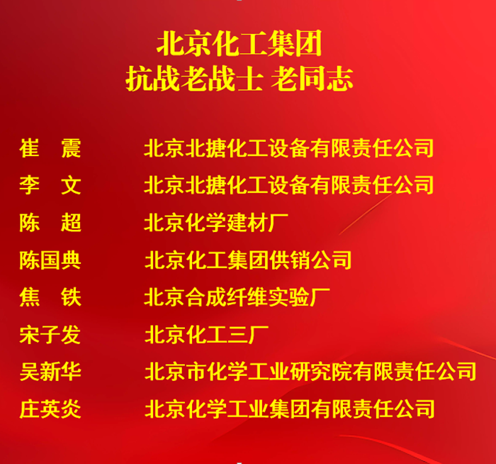 在紀念中國人民抗日戰(zhàn)爭暨世界反法西斯戰(zhàn)爭勝利 80 周年之際,黨中央、國務(wù)院、中央軍委為健在的抗戰(zhàn)老戰(zhàn)士、老同志授予“中國人民抗日戰(zhàn)爭勝利 80 周年紀念章”,北京化工集團8位抗戰(zhàn)老戰(zhàn)士、老同志榮獲紀念章。